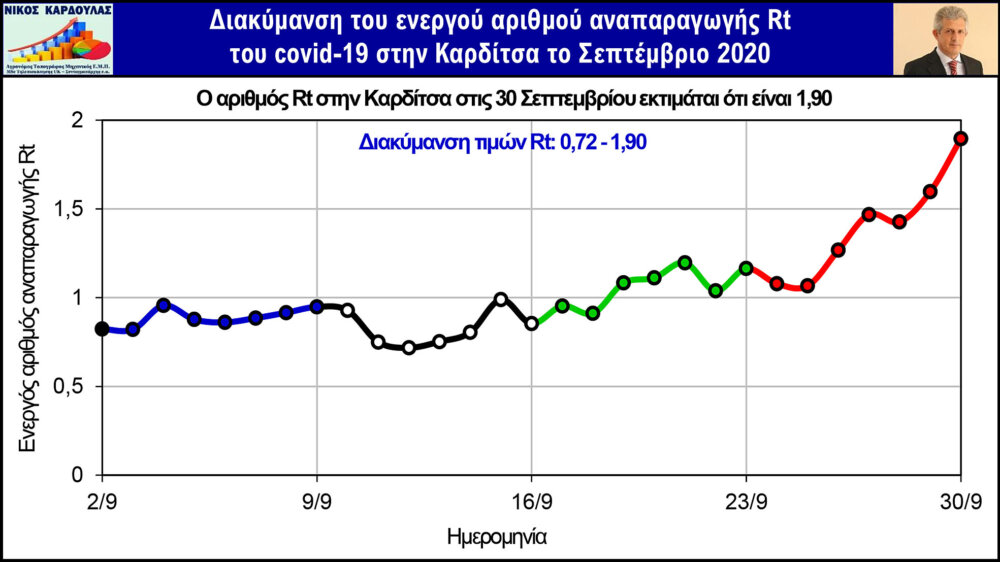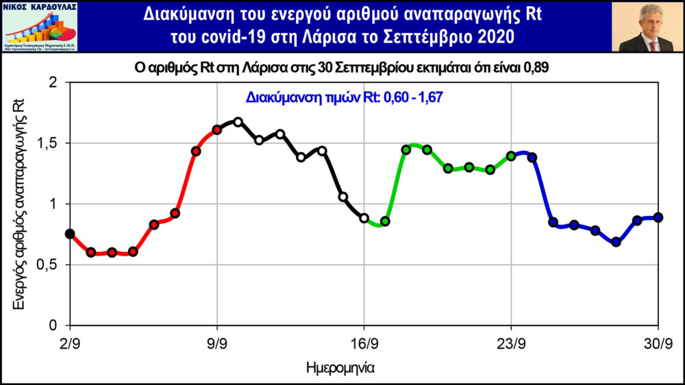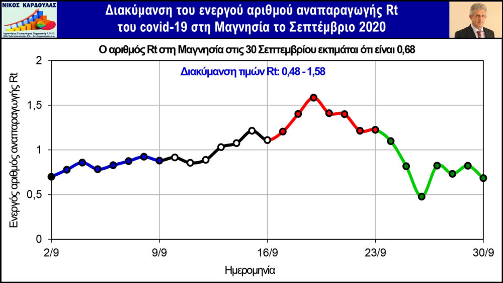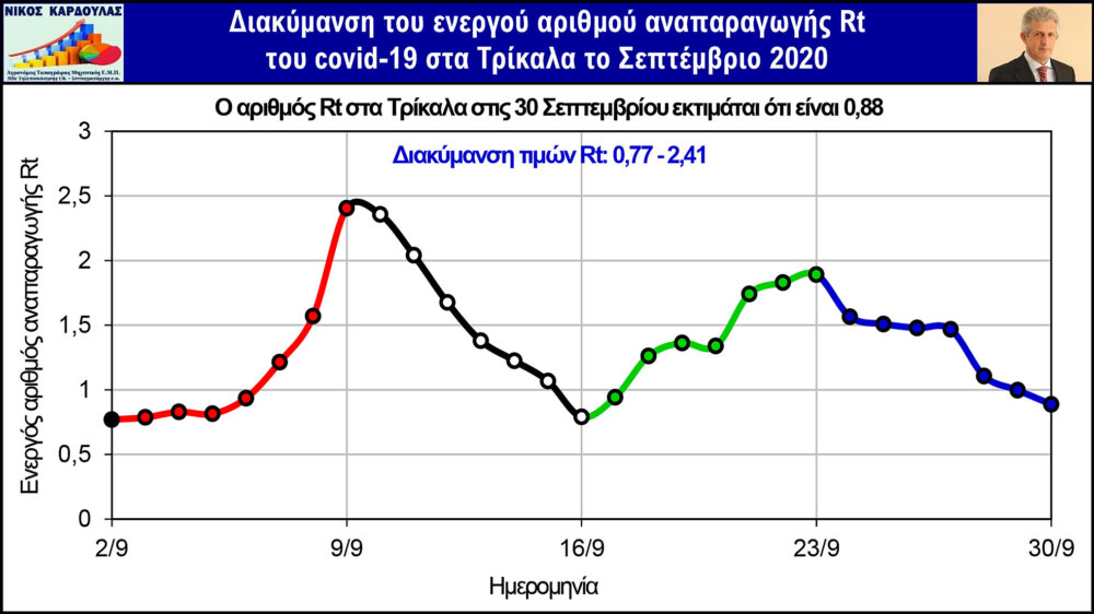 Στα παρακάτω γραφήματα απεικονίζονται η διακύμανση των τιμών του Rt στους 4 Θεσσαλικούς Νομούς το Σεπτέμβριο και από αυτά προκύπτει το παρακάτω συμπέρασμα: