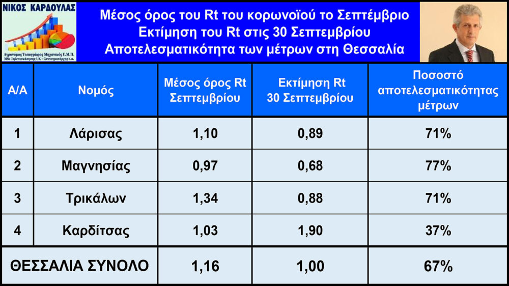 Στον παρακάτω πίνακα αποτυπώνεταιι η εκτίμηση του μέσου όρου του αριθμού Rt το Σεπτέμβριο στους Νομούς της Θεσσαλίας, η εκτίμηση του Rt στις 30 Σεπτεμβρίου και η αποτελεσματικότητα των μέτρων της κυβέρνησης στη μείωση της διασποράς του κορωνοϊού, χρησιμοποιώντας τον αλγόριθμο EpiEstim του Παγκόσμιου Οργανισμού Υγείας και επίσημα στοιχεία του ΕΟΔΥ.