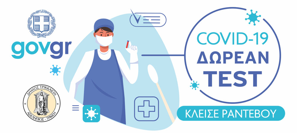 Ο Δήμος Τρικκαίων ενθαρρύνει και συστήνει σε κάθε πολίτη να πραγματοποιήσει ΔΩΡΕΑΝ έλεγχο για τον COVID-19. Η αντιμετώπιση της πανδημίας του κορονοϊού επιβάλλει ομοψυχία και την τήρηση των μέτρων που συνιστούν οι ειδικοί από όλους μας.