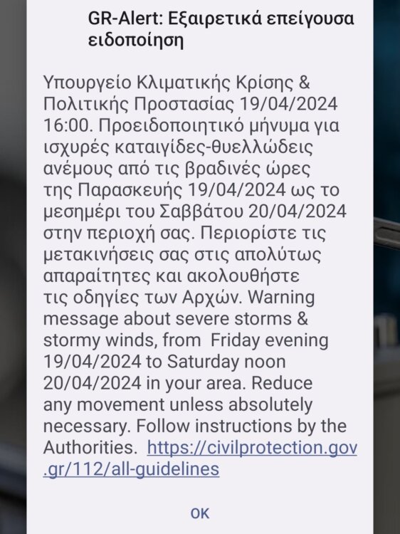 Μνήμες Daniel έφερε το μήνυμα του Υπουργείου Κλιματικής Κρίσης και Πολιτικής Προστασίας που στάλθηκε στα κινητά εντός της εμβέλειας των περιοχών που κινδυνεύουν, σήμερα στις 16.00 το απόγευμα. Το Υπουργείο συμβουλεύει περιορισμό μετακινήσεων αφού αναμένονται ισχυρές καταιγίδες και θυελλώδεις άνεμοι. Ας ελπίσουμε να είναι το μοναδικό μήνυμα που στέλνεται, και να μη χρειαστεί το …μπαράζ του Daniel.