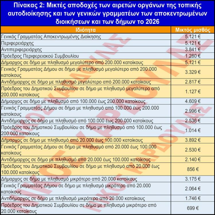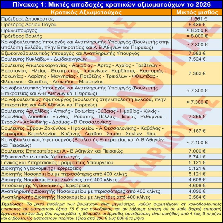 Λαμβάνοντας υπόψη επίσημα στοιχεία από τη Βουλή, από ΦΕΚ και από δημοσιεύσεις στο διαδίκτυο, συντάχθηκαν οι δύο παρακάτω πίνακες, όπου απεικονίζονται στον πίνακα 1 οι μικτές αποδοχές των κρατικών αξιωματούχων και στον πίνακα 2 οι μικτές αποδοχές των αιρετών οργάνων της Τοπικής Αυτοδιοίκησης και των Γενικών Γραμματέων των Αποκεντρωμένων Διοικήσεων και των Δήμων, για το έτος 2026.