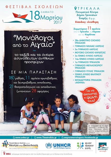 Τo Σάββατο 18 Μαρτίου 2017, στις 06:00 μ.μ. στο Πνευματικό κέντρο του Δήμου Τρικκαίων, πάνω από 180 μαθητές από 11 σχολεία πρωτοβάθμιας και δευτεροβάθμιας εκπαίδευσης της Θεσσαλίας (Τρίκαλα, Λάρισα, Καρδίτσα), σε μία παράσταση, ζωντανεύουν σκέψεις, αναμνήσεις, συναισθήματα και όνειρα ασυνόδευτων ανήλικων προσφύγων, που πέρασαν το Αιγαίο με την ελπίδα να ζήσουν σε έναν κόσμο που μας αγκαλιάζει όλους.