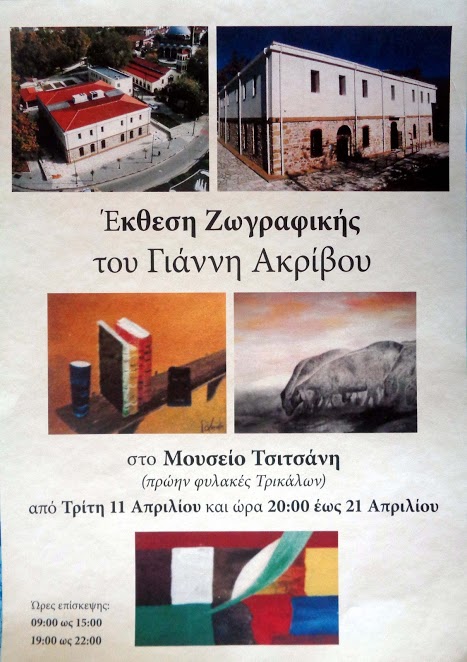 Ο Σύλλογος Τρικαλινών Ζωγράφων παρουσιάζει στο φιλότεχνο κοινό της πόλης μας Ατομική έκθεση ζωγραφικής του μέλους του Γιάννη Ακρίβου, στο Μουσείο Τσιτσάνη, από 11 μέχρι 21 Απριλίου.