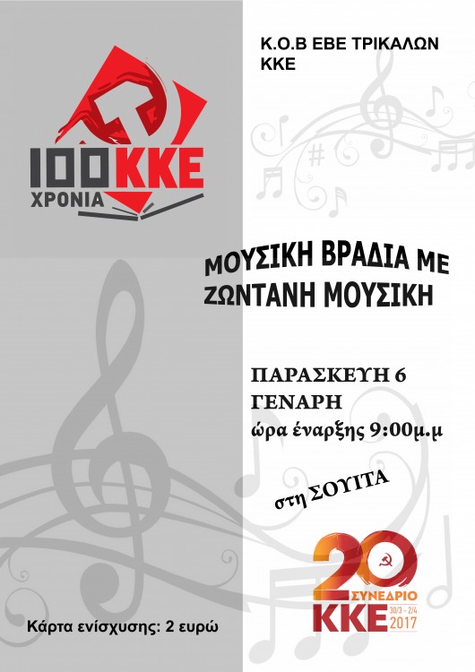 Μια ζεστή μουσική βραδιά , με ζωντανή μουσική και ποτό, μέσα στην καρδιά του χειμώνα , διοργανώνει την Παρασκευή 6 Γενάρη η Κομματική Οργάνωση ΕΒΕ του ΚΚΕ στα Τρίκαλα.. Η εκδήλωση θα πραγματοποιηθεί στο γνώριμο χώρο της «Σουίτα»( Στρατηγού Σαράφη 18) και θα ξεκινήσει στις 9μμ. Αποτελεί μιας πρώτης τάξης ευκαιρία σύντροφοι και φίλοι από το χώρο των αυτοαπασχολούμενων και επαγγελματιών ν’ ανταμώσουμε και δράσουμε στο πεδίο της διασκέδασης το ίδιο δυναμικά που δρούμε και στο πεδίο των κοινωνικών αγώνων!