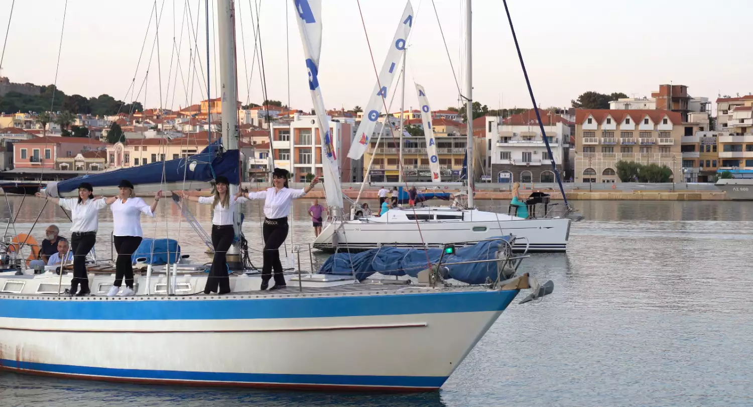 Τα ιστιοπλοϊκά του ΛΟΙΑΘ (Λεσβιακός Όμιλος Ανοικτής Θάλασσας) έπλεαν κυκλικά υπό τους ήχους της ιπτάμενης πιανίστριας Έλενας Ξυδιά και οι χορευτές χόρεψαν το συρτάκι του Ζορμπά, παρασέρνοντας ντόπιους και τουρίστες σε μια ατέλειωτη χορευτική αλυσίδα.