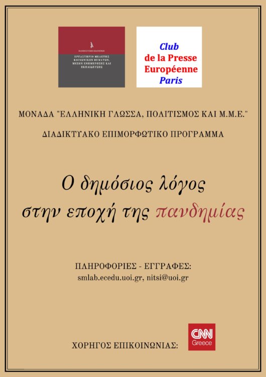 Το Εργαστήριο Μελέτης Κοινωνικών Θεμάτων, Μέσων Μαζικής Ενημέρωσης και Εκπαίδευσης (ΜΕ.Κ.ΘΕ.Μ.Ε.) του Π.Τ.Ν. του Πανεπιστημίου Ιωαννίνων σε συνεργασία με το Γαλλικό Τμήμα του Ομίλου Ευρωπαϊκού Τύπου (Club de la Presse Européenne, Paris) οργανώνουν Διαδικτυακό Επιμορφωτικό Πρόγραμμα, στο πλαίσιο της ανάδειξης επίκαιρων θεμάτων που αφορούν στη γλώσσα και στην επικοινωνία στην τρέχουσα κρίση της πανδημίας. Το πρόγραμμα έχει τον γενικό τίτλο: