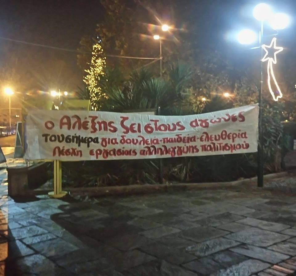 Πίσω από το πανό με το σύνθημα «ο Αλέξης ζει στους αγώνες του σήμερα…» , το φωτεινό χριστουγεννιάτικο δέντρο της πόλης στεκόταν επιβλητικά, «φορώντας» μια μικρή ελπίδα εκεί ψηλά.