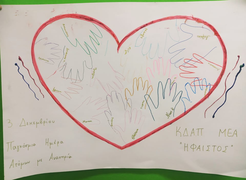 Το Κέντρο Δημιουργικής Απασχόλησης Ατόμων με Αναπηρίες ( ΚΔΑΠ-ΜΕΑ «ΗΦΑΙΣΤΟΣ») του Τμήματος Φροντίδας Παιδικής Ηλικίας της Δ/νσης Κοινωνικής Μέριμνας του Δήμου Τρικκαίων μέσα σε ένα κλίμα πολλών περιοριστικών μέτρων λόγω της πανδημίας, τίμησε με τον δικό του τρόπο την Παγκόσμια Ημέρα των Ατόμων Με Αναπηρίες.