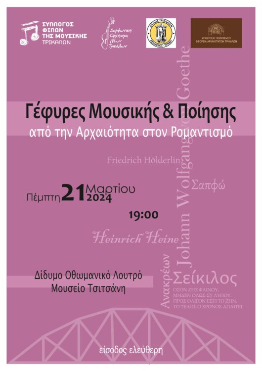 Ο Σύλλογος Φίλων της Μουσικής Τρικάλων (ΣΦΜΤ) διοργανώνει την Πέμπτη 21 Μαρτίου 2024 στις 7.00 μ.μ., σε συνεργασία με την Εφορεία Αρχαιοτήτων Τρικάλων, εκδήλωση με αφορμή την Παγκόσμια Ημέρα Ποίησης στην αίθουσα του Δίδυμου Οθωμανικού Λουτρού (Μουσείο Τσιτσάνη).