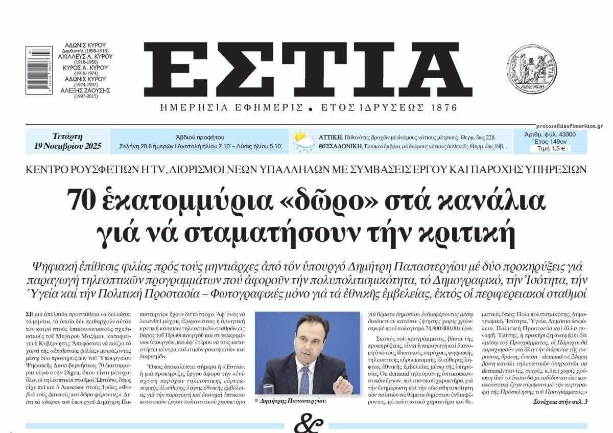 Δείτε το πρωτοσέλιδο της ΕΣΤΙΑΣ