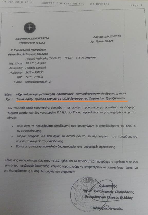 Για τον συγκεκριμένο συνάδελφο «εμπνεύστηκαν» οι δύο Δ.Ι.Υ. των νοσοκομείων και υπέγραψε ο Δ.Ι.Υ. του Π.Γ.Ν.Λ. στη θέση του απολυμένου διοικητή (την ημέρα της απόλυσής του) ένα πλασματικό πρόγραμμα εκπαίδευσης, στο όνομα του οποίου επιχειρείται η νέα και παράνομη μετακίνηση. Προς επίρρωση των ως άνω, αναφέρουμε ότι τον Μάρτιο του 2014 έγινε και πάλι απόπειρα μετακίνησης του εν λόγω συναδέλφου από τον Π.Γ.Ν.Λ. στο Γ.Ν. Βόλου, αλλά αποτράπηκε, όταν με παρέμβαση της ΟΤΑΕΔ και του Σωματείου Εργαζομένων του ΠΓΝΛ αποκαλύφθηκε στην ηγεσία του Υ.Υ. και της 5ης Υ. ΠΕ., το επιχειρούμενο σχέδιο «εξόντωσης» του συναδέλφου.