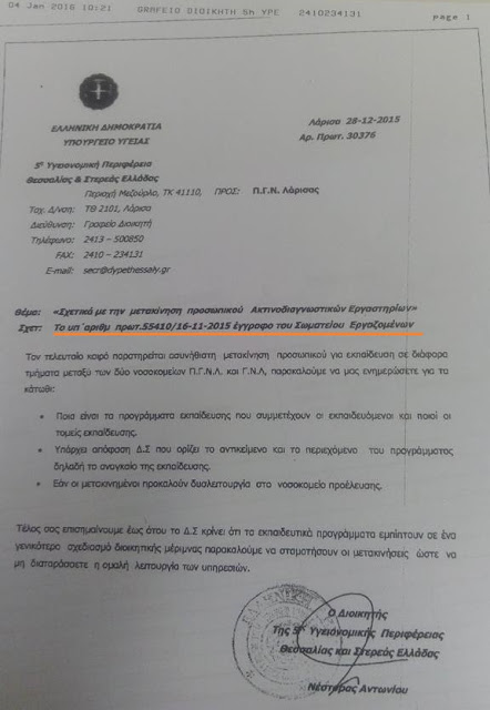 «Συμπωματικά» μετακινούνται οι συνάδελφοι, που τόλμησαν να μηνύσουν τον Διευθυντή Ιατρικής Υπηρεσίας του Π.Γ.Ν.Λ. για υπόθεση η οποία έχει παραπεμφθεί στην τακτική δικαιοσύνη. Η αρχή έγινε πριν από 3 μήνες με Τεχνολόγο Ραδ. Ακτινολογίας η οποία συμμετείχε στη μήνυση κατά του Διευθυντή και συνεχίζεται με τη νέα μετακίνηση συνάδελφου, που θεωρείται από τον μηνυόμενο (ο οποίος εκφράζει και τη διοίκηση πλέον), ότι είναι ο «κινητήριος μοχλός» της μηνυτήριας αναφοράς.