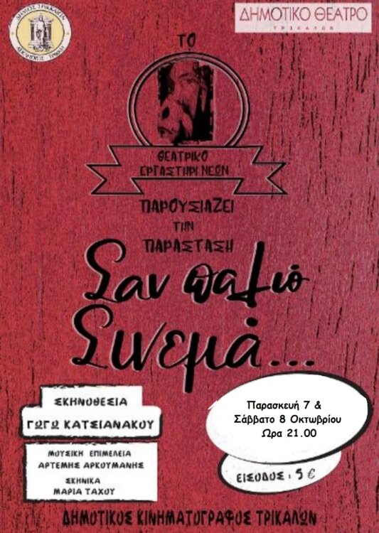 Μετά τη μεγάλη επιτυχία της περασμένης άνοιξη, το Θεατρικό Εργαστήρι Νέων του Δημοτικού Θεάτρου Τρικάλων παρουσιάζει και πάλι την παράσταση «Σαν παλιό σινεμά…». Η παράσταση θα δοθεί την Παρασκευή 7 Οκτωβρίου και το Σάββατο 8 Οκτωβρίου, στις 21.00 στην αίθουσα του Δημοτικού Κινηματογράφου, στον Μύλο του Ματσόπουλου.