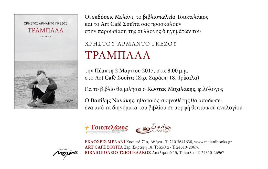 Οι εκδόσεις Μελάνι, το βιβλιοπωλείο Τσιοπελάκος και το art Café Σουίτα σας προσκαλούν στην παρουσίαση της συλλογής διηγημάτων του Χρήστου Αρμάντο Γκέζου, «Τραμπάλα»