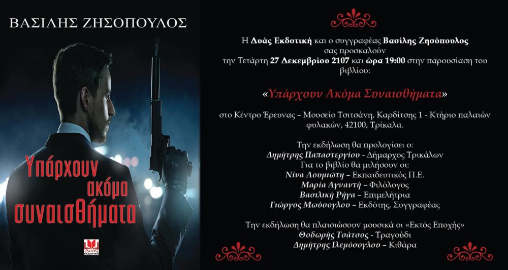 Η Δυάς Εκδοτική και ο συγγραφέας Βασίλης Ζησόπουλος διοργανώνουν την Τετάρτη 27 Δεκεμβρίου 2107 και ώρα 19:00 παρουσίαση του βιβλίου: «Υπάρχουν Ακόμα Συναισθήματα».