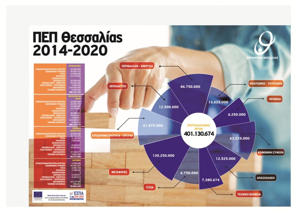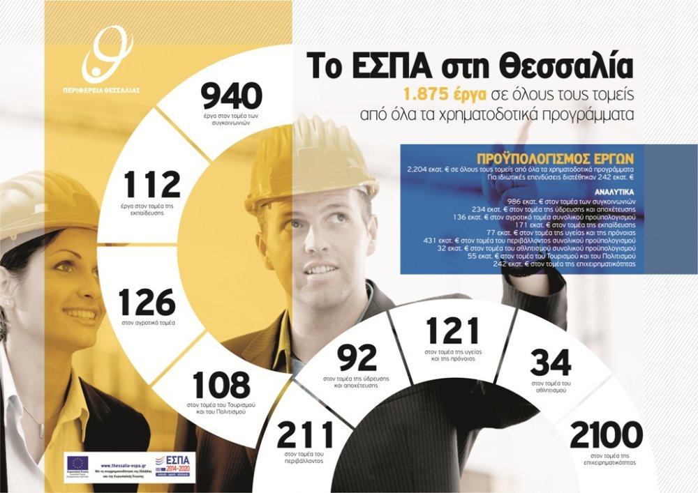 Το σύνολο των έργων -δράσεων που διεκδικήθηκαν, εντάχθηκαν, υλοποιούνται, συνεχίζονται και ολοκληρώνονται στην Περιφέρεια Θεσσαλίας από όλα τα χρηματοδοτικά Προγράμματα είναι 1875, συνολικού προϋπολογισμού 2,2 δις € ενώ για ιδιωτικές επενδύσεις διατέθηκαν 242.000.000 €. Τα έργα και οι δράσεις αυτές είναι μια πηγή πραγματικής ελπίδας στη ζωή των Θεσσαλών γιατί δημιουργούν θέσεις, εργασίας, μόχλευση στην τοπική οικονομία και κινούν την πραγματική οικονομία της περιοχής. Είναι μια προσπάθεια, η οποία έχει μετρήσιμα αποτελέσματα. Διεκδικήσαμε, χρηματοδοτήσαμε, απορροφήσαμε και υλοποιούνται έργα σε όλους τους τομείς: