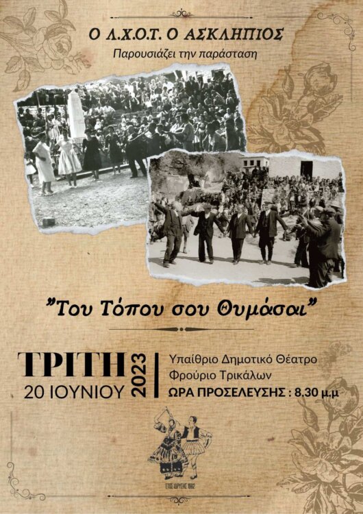 «Του τόπου σου θυμάσαι» είναι ο τίτλος της Πολιτιστικής εκδήλωσης του Λαογραφικού- Χορευτικού Ομίλου Τρικάλων «ΑΣΚΛΗΠΙΟΣ», που θα πραγματοποιηθεί σήμερα, Τρίτη, 20 Ιουνίου 2023, στις 8.30 μ. μ, στο Υπαίθριο Θέατρο του Φρουρίου Τρικάλων, υπό την αιγίδα της Περιφέρειας Θεσσαλίας-Περιφερειακή Ενότητα Τρικάλων, την οποία ευχαριστούμε θερμά, όπως και τον Δήμο Τρικκαίων για τη συνεχή αρωγή του και την παραχώρηση χώρων!