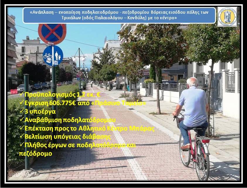 Το καλύτερο… δώρο για την ονομαστική γιορτή του Δήμαρχου Τρικκαίων, ήταν η έγκριση της χρηματοδότησης του έργου για την αναμόρφωση του ποδηλατόδρομου της οδού Κονδύλη. Ανήμερα της γιορτής του Αγίου Δημητρίου, στις 26 Οκτωβρίου 2020, το «Πράσινο Ταμείο» γνωστοποίησε την έγκριση των 606.775 € για το έργο με τον τίτλο «Ανάπλαση – ενοποίηση ποδηλατοδρόμου – πεζοδρομίου Βόρειας εισόδου πόλης των Τρικάλων (οδός Παλαιολόγου – Κονδύλη) με το κέντρο».