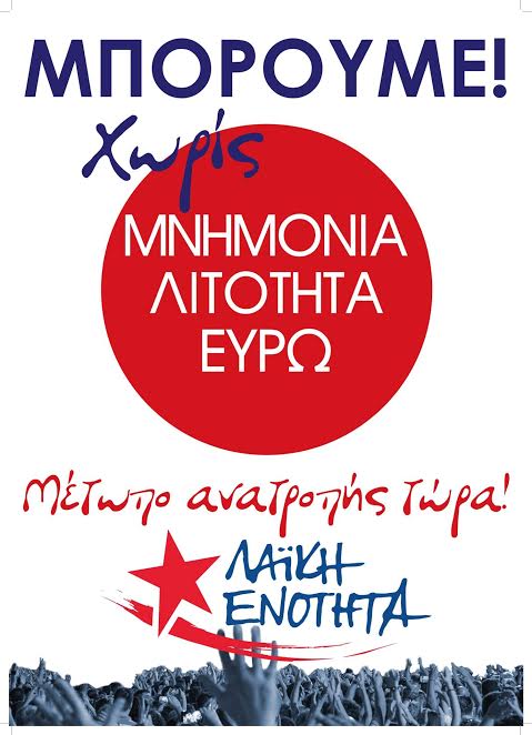 Βασικά σημεία της εναλλακτικής πρότασης της ΛΑ.Ε είναι η ακύρωση των μνημονίων,η εξόδος απο την ΟΝΕ και η μετάβαση σε εθνικό νόμισμα,η σύγκρουση με την Ε.Ε,η διαγραφή του δημοσίου χρέους,η εθνικοποίηση των τραπεζών, η διευρυμένη “σεισάχθεια” στα ιδιωτικά χρέη για τα φτωχά λαϊκά στρώματα και τους ανέργους και ένα πρόγραμμα παραγωγικών επενδύσεων και παραγωγικού μετασχηματισμού της οικονομίας.