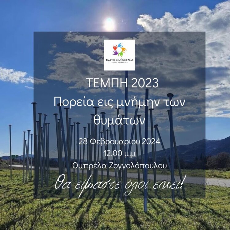 Η 28η Φεβρουαρίου είναι ημέρα αλληλεγγύης και κινητοποίησης. Το Δημοτικό Συμβούλιο Νέων του Δήμου Τρικκαίων, διοργανώνει σιωπηλή πορεία σε ένδειξη σεβασμού και με το αίσθημα της ευθύνης να συντηρηθεί η μνήμη εκείνων που μάταια χάθηκαν. Έχοντας ως σημείο συγκέντρωσης την «Ομπρέλα» Ζογγολόπουλου και κατεύθυνση προς τον σταθμό του ΟΣΕ, όπου θα γίνει κατάθεση στεφάνων, προσκαλείται ολόκληρη η πόλη των Τρικάλων, με καρδιές καθάριες και γεμάτες αγάπη, να συμμετέχουν στην πορεία αυτή.