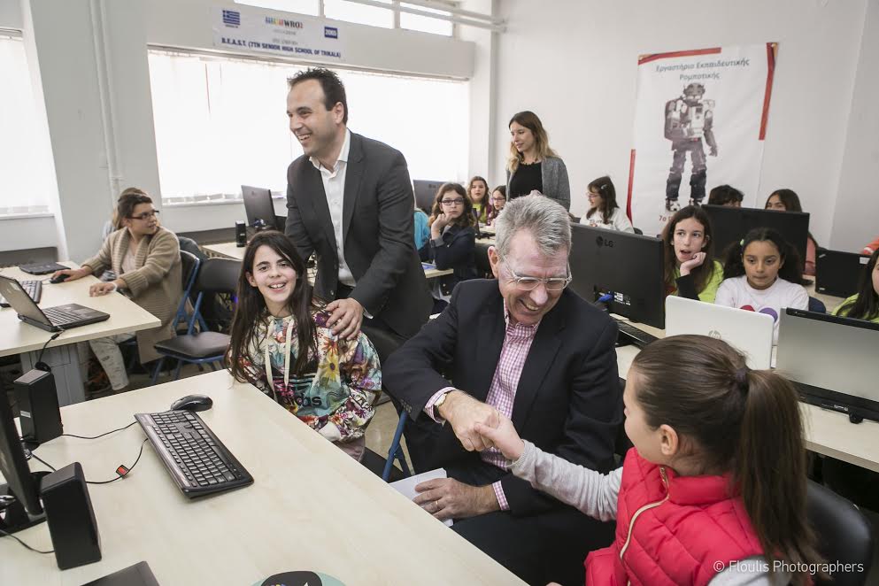 Ο κ. Πράιατ, αφού ενημερώθηκε για τα όσα έμαθαν οι συμμετέχουσες σε 4 ημέρες (11-12 και 18-19 Μαρτίου 2017), κάθησε μαζί τους και με τον Δήμαρχο Τρικκαίων κ. Δημήτρη Παπαστεργίου στα θρανία. Εκεί είδαν στην πράξη το επίπεδο στο οποίο έφτασαν τα κορίτσια των Τρικάλων, μετέχοντας σε διαδραστικό ηλεκτρονικό παιχνίδι.