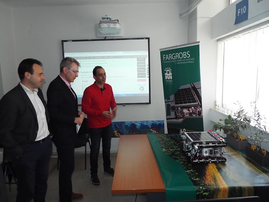 Στη συνέχεια, στους χώρους του 7ου Λυκείου Τρικάλων, είδαν από κοντά το ρομπότ της Ομάδας Ρομποτικής του σχολείου, που πήρε το πρώτο βραβείο στον 1ο Πανελλήνιο Διαγωνισμό Ρομποτικής για Λύκεια. Πρόκειται για το Fargrobs (Farming with Green Robotic System), μια εικονική επιχείρηση που χρησιμοποιεί το ρομπότ (κινείται με φωτοβολταϊκά πάνελς) για να «διαβάσει» την ατμόσφαιρα, να βρει το κάθε δέντρο – φυτό μιας καλλιέργειας και να χρησιμοποιήσει την κατάλληλη ποσότητα για ψεκασμό.