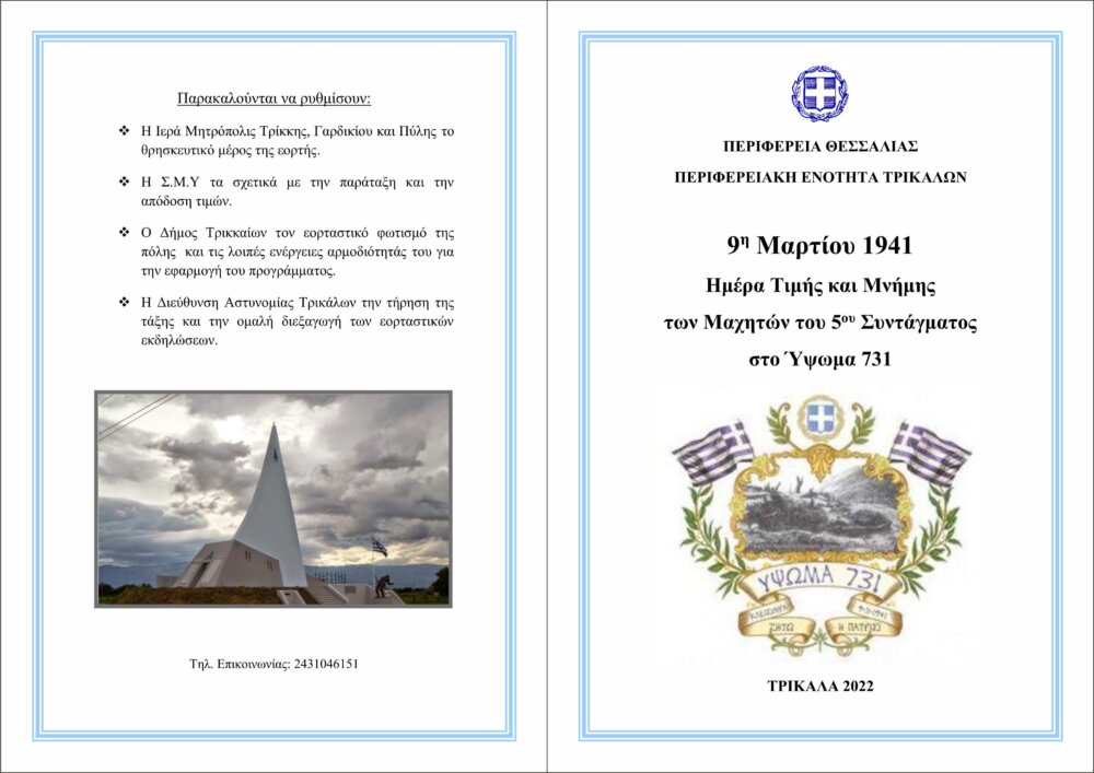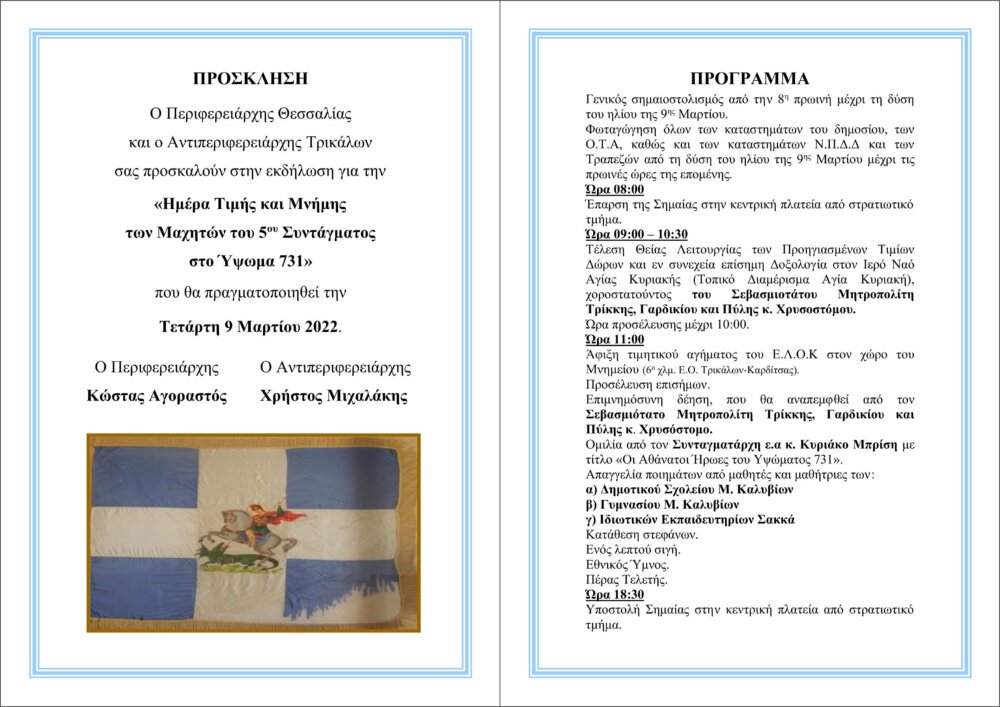 Πρόσκληση της Π.Ε. Τρικάλων στον εορτασμό της 9ης Μαρτίου 1941, ημέρα τιμής και μνήμης για τους μαχητές του 5ου Συντάγματος στο Ύψωμα 731: