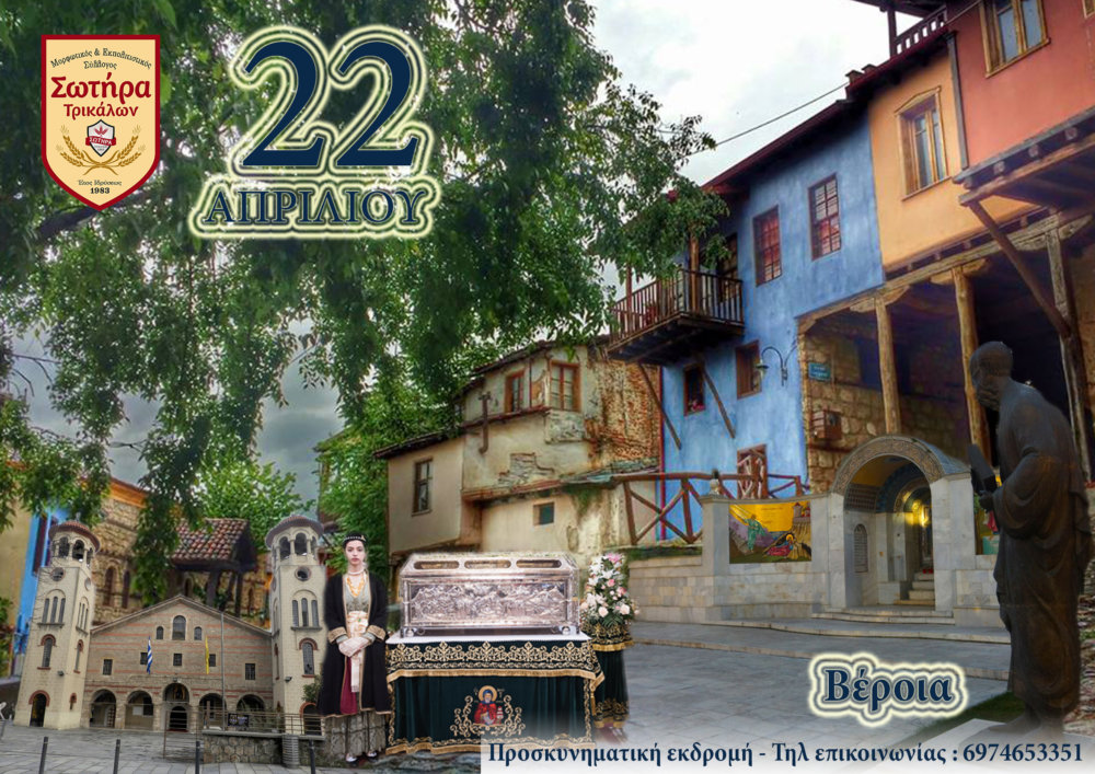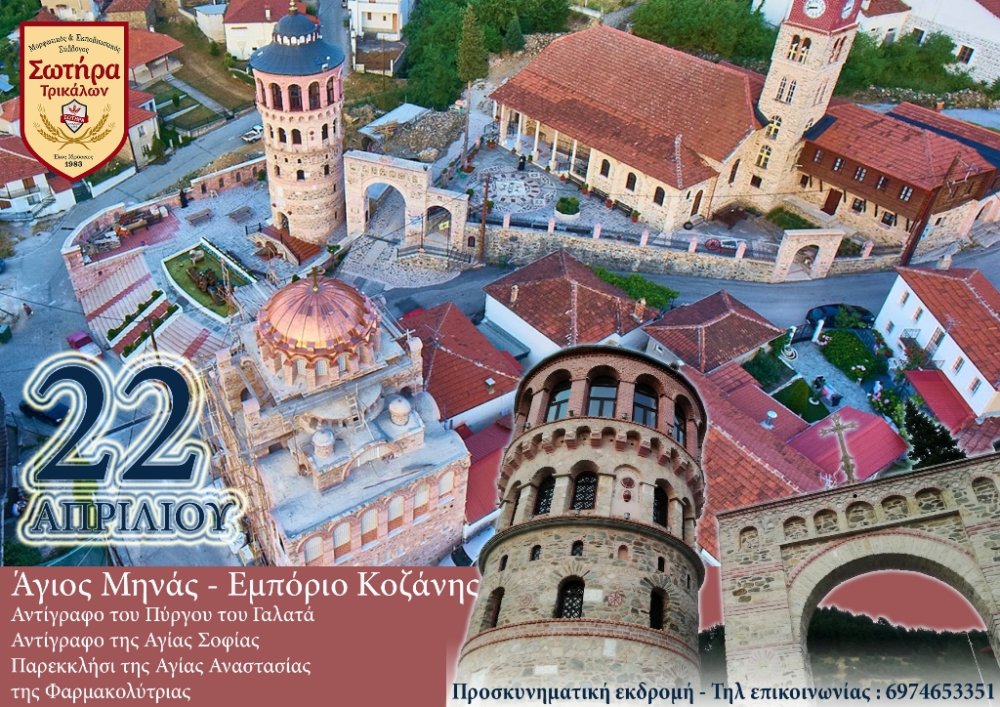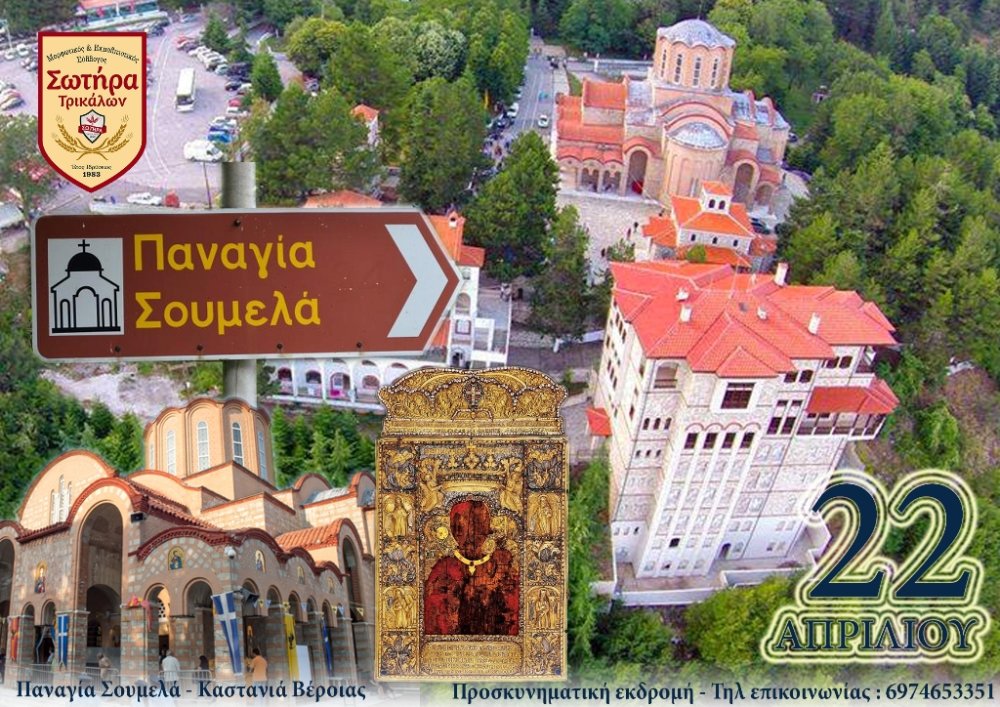 Ο Μορφωτικός & Εκπολιτιστικός Σύλλογος Σωτήρα Τρικάλων διοργανώνει την Κυριακή 22 Απριλίου 2018 προσκυνηματική εκδρομή Ι. Ν. Αγίου Μηνά (Εμπόριο Κοζάνης) και στην Ι. Μ. Παναγίας Σουμελά (Καστανιά Βέροιας). Το αναλυτικό πρόγραμμα της εκδρομής έχει ως εξής: