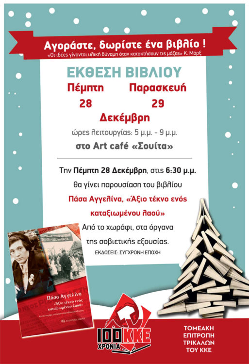 Στο πλαίσιο της Έκθεσης θα γίνει παρουσίαση της έκδοσης της Σύγχρονης Εποχής «Πάσα Αγγελίνα, άξιο τέκνο ενός καταξιωμένου λαού», από το χωράφι, στα όργανα της σοβιετικής εξουσίας. Το βιβλίο αναφέρεται στην Πάσα Αγγελίνα, μια εργάτρια γης που οι συνθήκες στην ΕΣΣΔ, οι συνθήκες του Σοσιαλισμού, της έδωσαν τη δυνατότητα να γίνει βουλευτής του Ανώτατου Σοβιέτ. Η παρουσίαση θα πραγματοποιηθεί σήμερα Πέμπτη 28 Δεκέμβρη , στις 6:30μμ.