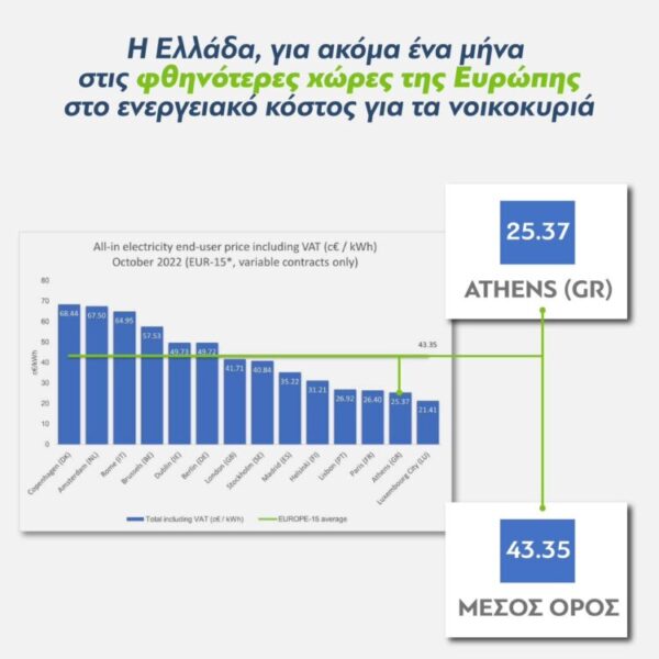 Ειδικότερα, στην Ελλάδα, η μέση τιμή της κιλοβατώρας διαμορφώθηκε στα 25,37 λεπτά/KWh, την ώρα που μεγάλες ευρωπαϊκές χώρες όπως η Δανία (68,44 λεπτά/KWh), η Ολλανδία (67,50 λεπτά/KWh), η Ιταλία (64,95 λεπτά/KWh) και το Βέλγιο (57,53 λεπτά/KWh) καταγράφουν υψηλές τιμές ηλεκτρικού ρεύματος. Η τιμή λιανικής στα κυμαινόμενα τιμολόγια της Ισπανίας είναι κατά 39% ακριβότερη σε σχέση με την Ελλάδα και της Πορτογαλίας κατά 6%.
