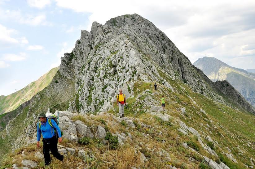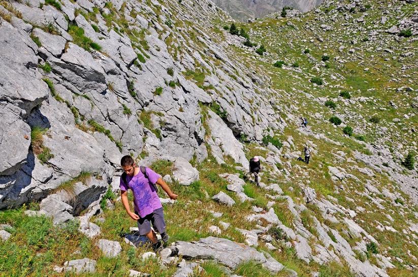 Έχει φτάσει η ώρα για διάλειμμα και ένα καλό σχεδιασμό για το τελευταίο κομμάτι της διαδρομής. Το έδαφος σαθρό, απότομο, με μεγάλη κλίση. Η ανάβαση πρέπει να γίνει κατά κόρων κόντρα και η χρήση των χεριών είναι απαραίτητη, ωστόσο διευκολύνεται από την παρουσία μεγάλων, σταθερών βράχων. Στα δεξιά μας μπορούμε, έπειτα από λίγο ψάξιμο, να δούμε τη χιονότρυπα η οποία λέγεται ότι κατά την περίοδο της Τουρκοκρατίας λειτούργησε ως μυστική δίοδος για τους κατοίκους της περιοχής κατά τη φυγή τους προς την Ήπειρο. Έπειτα από το σκαρφάλωμα φτάνουμε ξανά σε αλπικό πεδίο στον αυχένα των δύο κορυφών και κινούμαστε νότια προς την ψηλότερη.