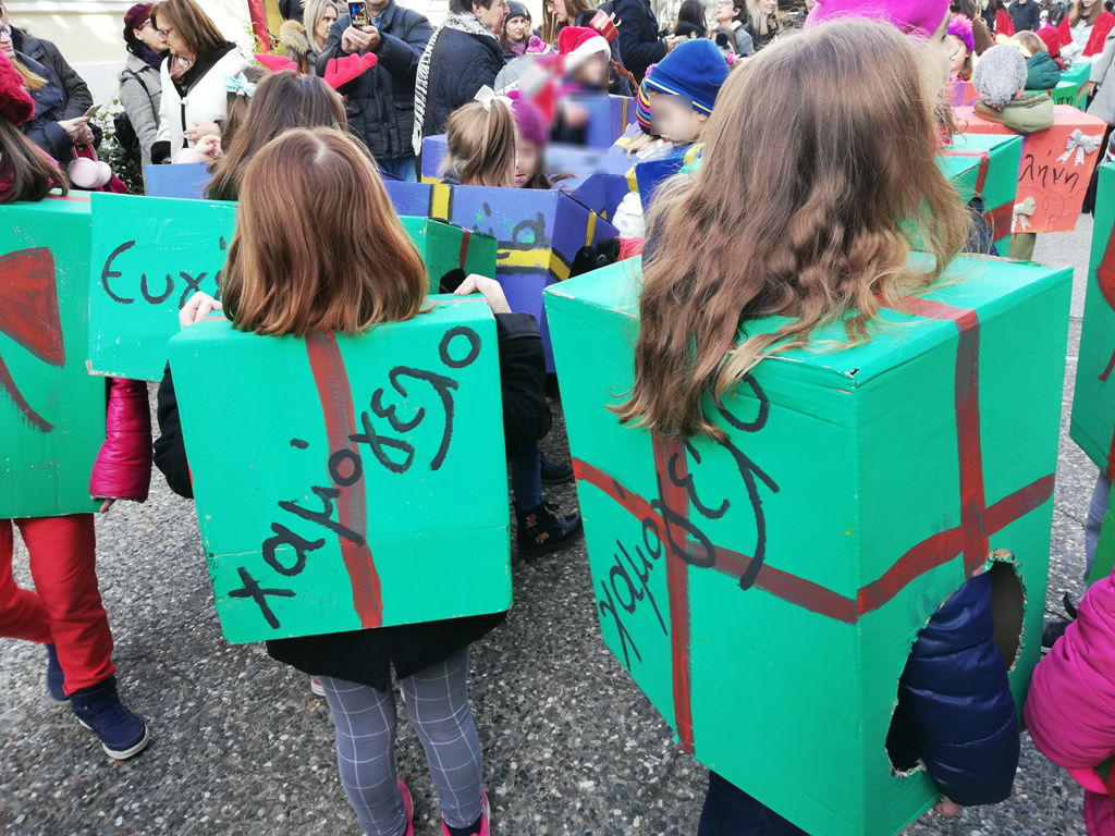 – τα ανθρώπινα «δώρα» με αισιόδοξα μηνύματα, με τα οποία ντύθηκαν τα παιδιά του αντίστοιχου τμήματος των Εργαστηρίων του Δημοτικού Θεάτρου