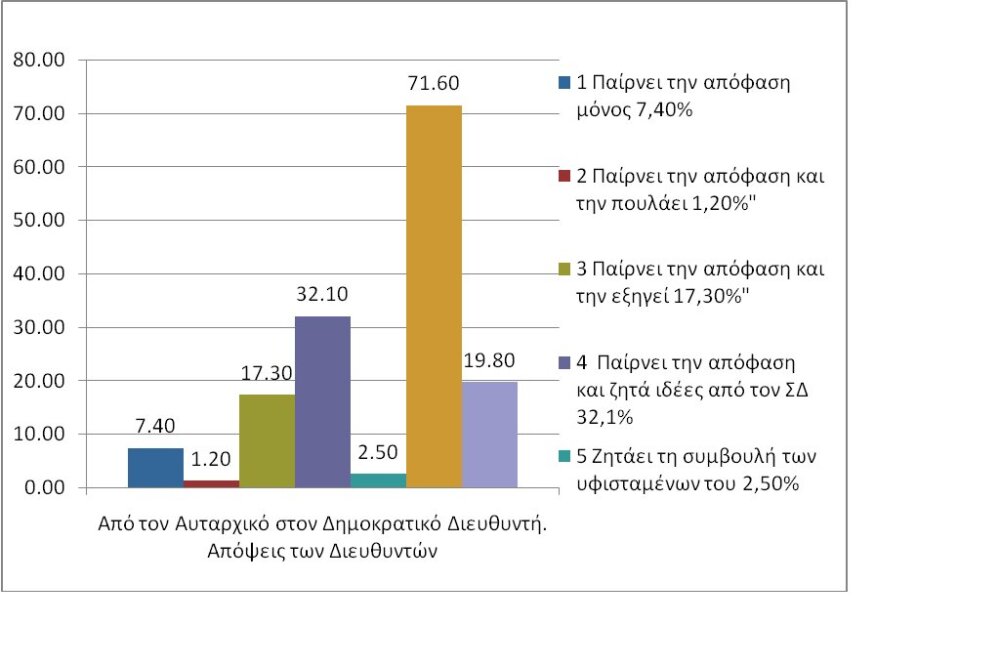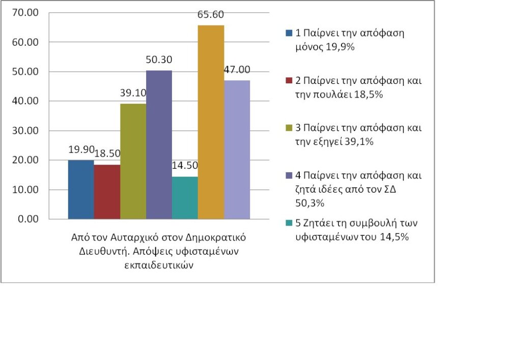 Επιπλέον στις τρεις πρώτες ερωτήσεις οι διευθυντές δηλώνουν (πρώτο μέρος) πως δεν συμπεριφέρονται αυταρχικά στους εκπαιδευτικούς των σχολείων τους κατά τις διαδικασίες λήψης συλλογικής απόφασης (διατάζουν=7,4%, πείθουν=1,2%, παίρνουν την απόφαση εξηγώντας την στους υφισταμένους=17,3%). Στις ερωτήσεις αυτές (δεύτερο μέρος) τα αντίστοιχα ποσοστά των εκπαιδευτικών είναι ιδιαίτερα αυξημένα (διατάζουν=19,9%, πείθουν=18,5%, παίρνουν την απόφαση εξηγώντας την στους υφισταμένους=39,1%).