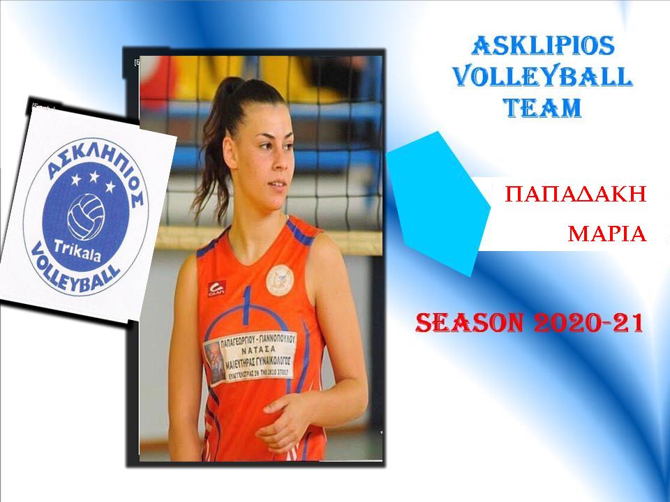 Στον Ασκληπιό θα βρίσκεται για την επόμενη χρονιά η Παπαδάκη. Η  Μαρία που αγωνίζεται στη θέση του libero, έρχεται απ το Ηράκλειο της Κρήτης και όλα τα προηγούμενα χρόνια αγωνιζόταν με την ομάδα της ΓΕ Ηρακλείου..