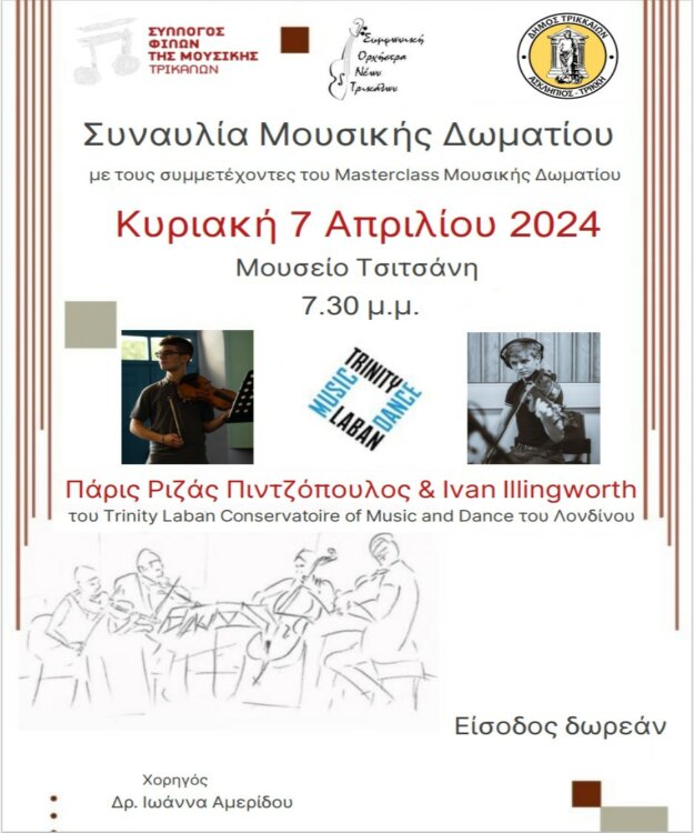 Ο Σύλλογος Φίλων Μουσικής Τρικάλων σε συνδιοργάνωση με την Διεύθυνση Πολιτισμού Του Δήμου Τρικκαίων πραγματοποιεί συναυλία Μουσικής Δωματίου την Κυριακή 7 Απριλίου 2024 στις 7.30 μ.μ. στο Μουσείο Τσιτσάνη.
