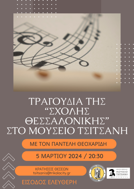 Η εκδήλωση θα πραγματοποιηθεί την Τρίτη 5 Μαρτίου στις 8:30 μ.μ. στο Μουσείο Τσιτσάνη με ελεύθερη είσοδο για το κοινό.