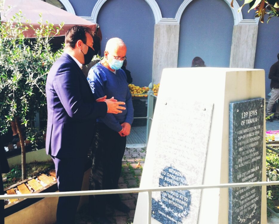 Ο κ. Amrani στη συνέχεια δέχθηκε δώρα φιλοξενίας από τον κ. Παπαστεργίου και αμφότεροι κατευθύνθηκαν στο μνημείο των 139 τρικαλινών Εβραίων – θύματα του Ολοκαυτώματος, αλλά και στη Συναγωγή, που έχει αναστηλωθεί με τη συνδρομή του Γερμανικού Κράτους και την ενεργή στήριξη του Γερμανικού Προξενείου στη Θεσσαλονίκη.