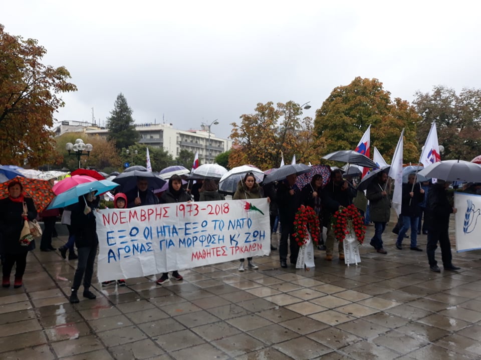 «Ακόμα και σήμερα, τα βασικά αιτήματα της εξέγερσης του Νοέμβρη για Ψωμί – Παιδεία – Ελευθερία και των συνθημάτων που ήταν γραμμένα στη ματωμένη πύλη του Πολυτεχνείου ΕΞΩ ΟΙ ΗΠΑ – ΕΞΩ ΤΟ ΝΑΤΟ παραμένουν επίκαιρα, όσο ποτέ άλλοτε. Η πολιτική της Κυβέρνησης ΣΥΡΙΖΑ –ΑΝΕΛ με μια σειρά αντεργατικών – αντιλαϊκών μέτρων, με τα ματωμένα πλεονάσματα, την υψηλή φορολογία, την άρνηση της επαναφοράς του κατώτατου μισθού στα 751 ευρώ, τη μείωση του αφορολόγητου, την καταρράκωση των συντάξεων με το νόμο Κατρούγκαλου» ανέφερε μεταξύ άλλων ο κεντρικός ομιλητής της εκδήλωσης, γραμματέας της Επιτροπής Ειρήνης Τρικάλων Λάζαρος Τσουμένης.