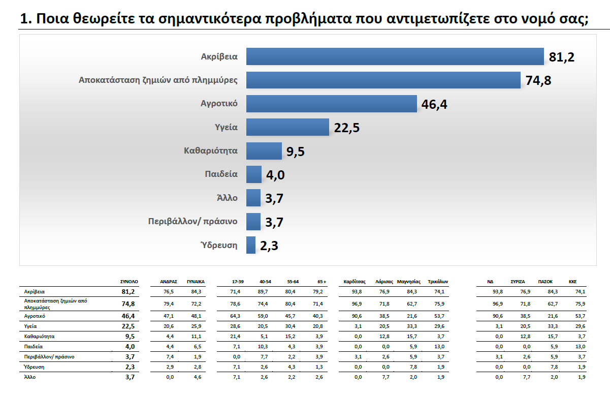Η καλπάζουσα ακρίβεια σε ποσοστό 81,2% αποτελεί το υπ’ αριθμόν ένα ζητούμενο και για τους κατοίκους της Θεσσαλίας, όπως ακριβώς συμβαίνει και σε πανελλαδικό επίπεδο σύμφωνα με δημοσκόπηση της GPO. Στη δεύτερη θέση με ποσοστό 74,8% εμφανίζεται το ζήτημα της αποκατάστασης των ζημιών από τις πλημμύρες του περασμένου Σεπτεμβρίου, ποσοστό που εκτοξεύεται στο 96,9% στο νομό Καρδίτσας που δέχτηκε το ισχυρότερο χτύπημα, την στιγμή που οι πληγέντες βλέπουν τη διαδικασία των αποζημιώσεων να προχωρά με αργούς ρυθμούς. Η έρευνα διεξήχθη εν μέσω των αγροτικών κινητοποιήσεων, γεγονός που φέρνει στην τρίτη θέση το αγροτικό με 46,4%, ένα ζήτημα που, ούτως ή άλλως, είναι κομβικής σημασίας για την τοπική οικονομία.