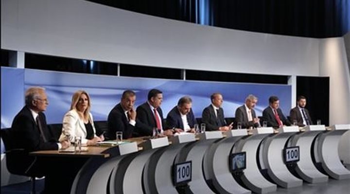 Η πρώτη τηλεοπτική αναμέτρηση των υποψηφίων, που έγινε το βράδυ και μεταδόθηκε τηλεοπτικά από τη δημόσια τηλεόραση, επικεντρώθηκε στη πολιτική των συνεργασιών, στην ανάγκη να μεταρρυθμιστεί το πολιτικό σύστημα και το κράτος ώστε να ενισχυθεί η παραγωγική Ελλάδα, να αναθεωρηθεί για αυτό το Σύνταγμα και να αλλάξει ο εκλογικός νόμος της απλής αναλογική.
