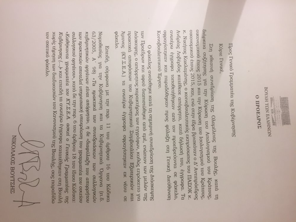 Δείτε την επιστολή Βούτση για τα απόρρητα έγγραφα που κατέθεσε στην Ολομέλεια της Βουλής ο κοινοβουλευτικός εκπρόσωπος του ΠΑΣΟΚ, Ανδρέας Λοβέρδος.
