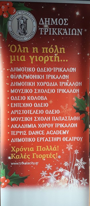 Η άψογη συνεργασία με σχολές χορού και τις δομές πολιτισμού του Δήμου Τρικκαίων, οδήγησαν σε ένα πρόγραμμα εκδηλώσεων μουσικής, χορού, θεατρικών παραστάσεων. Στα μανάβικα, στους πεζοδρόμους, σε πλατείες, η πανδαισία ήχων και εικόνων, η δημιουργία των τοπικών συλλόγων, «χρωματίζει» τα Χριστούγεννα.