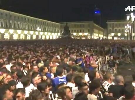 Εκατοντάδες φίλαθλοι της Γιουβέντους -υπολογίζονται στους 600- τραυματίστηκαν στην κεντρική πλατεία Σαν Κάρλο του Τορίνο, όπου παρακολουθούσαν τον τελικό του Champions League σε γιγαντοοθόνη, όταν επικράτησε πανικός από δυνατό κρότο που τελικά ήταν βεγγαλικό.