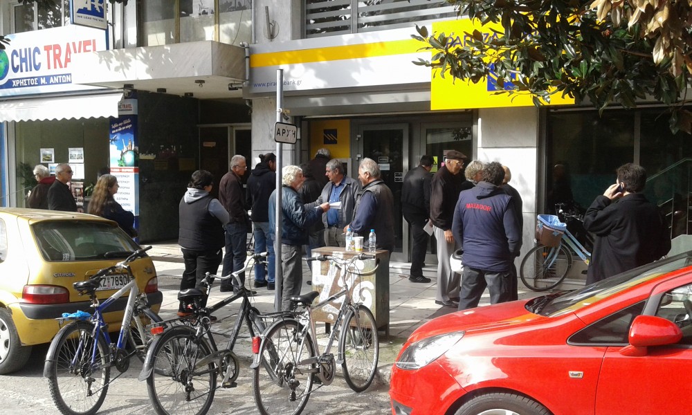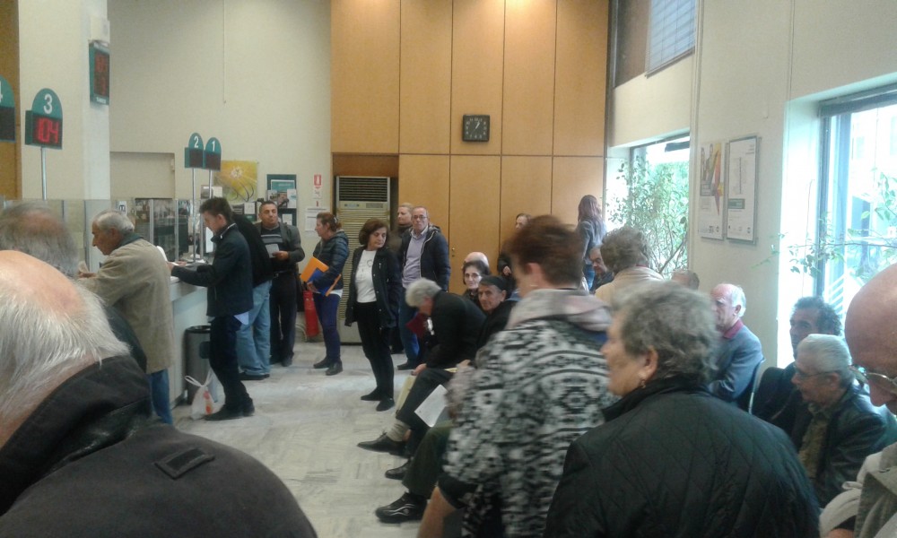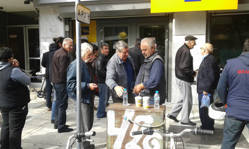 Παππούδες και γιαγιάδες με το βιβλιάριο στο χέρι να περιμένουν να καταθέσουν τα χρήματα για τον ΕΝΦΙΑ (που θα καταργούσε η κυβέρνηση της αριστεράς), κόβοντας τους παράλληλα την σύνταξη, η οποία είναι αμφίβολο με την οικτρή οικονομική κατάσταση, αν θα πληρωθεί μέχρι το τέλος του μήνα.