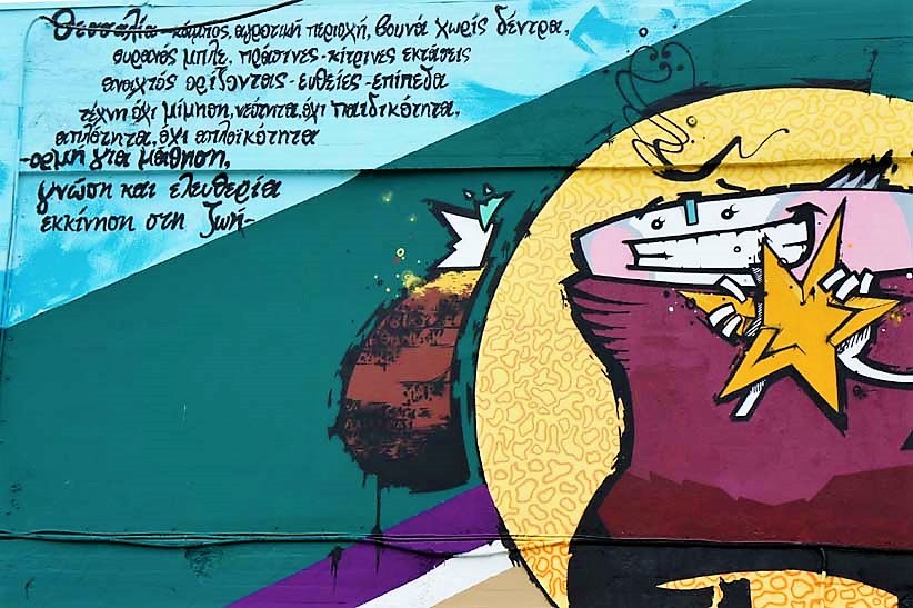 Ο Αχιλλέας έστειλε στον Same84 μερικές λέξεις για να κατανοήσει τους παιδαγωγικούς του στόχους. Τις λέξεις θα τις βγείτε γραμμένες σε μια από τις τοιχογραφίες: «Θεσσαλία, κάμπος, αγροτική περιοχή, βουνά χωρίς δέντρα, ουρανός μπλε, πράσινες – κίτρινες εκτάσεις, ανοιχτός ορίζοντας, ευθείες – επίπεδα, τέχνη όχι μίμηση, νεότητα όχι ανωριμότητα, απλότητα όχι απλοϊκότητα, ορμή για μάθηση, γνώση και ελευθερία, εκκίνηση στη ζωή». Το αποτέλεσμα μας δικαιώνει όλους.