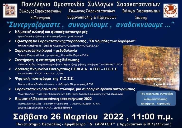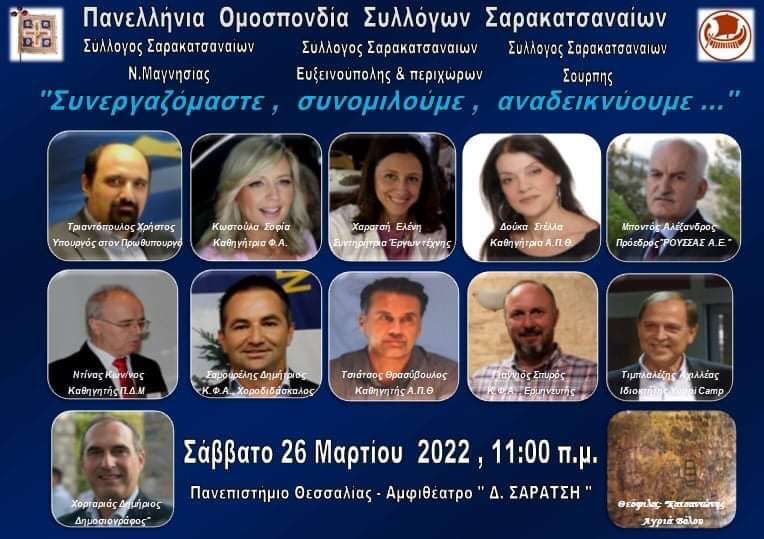 Το τριήμερο 25 έως 27 Μαρτίου 2022 η πόλη του Βόλου, θα φιλοξενήσει εργασίες και εκδηλώσεις της Πανελλήνιας Ομοσπονδίας Συλλόγων Σαρακατσαναίων, με θέμα «Συνεργαζόμαστε-συνομιλούμε-αναδεικνύουμε».