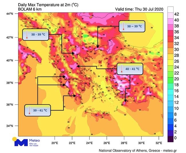 Έτσι, από σήμερα Πέμπτη 30/07 έως και το Σάββατο 01/08 σε αρκετές περιοχές της χώρας οι μέγιστες θερμοκρασίες θα πλησιάσουν ή και θα ξεπεράσουν τους 40 βαθμούς, ενώ κατά τόπους θα επικρατήσουν συνθήκες καύσωνα.