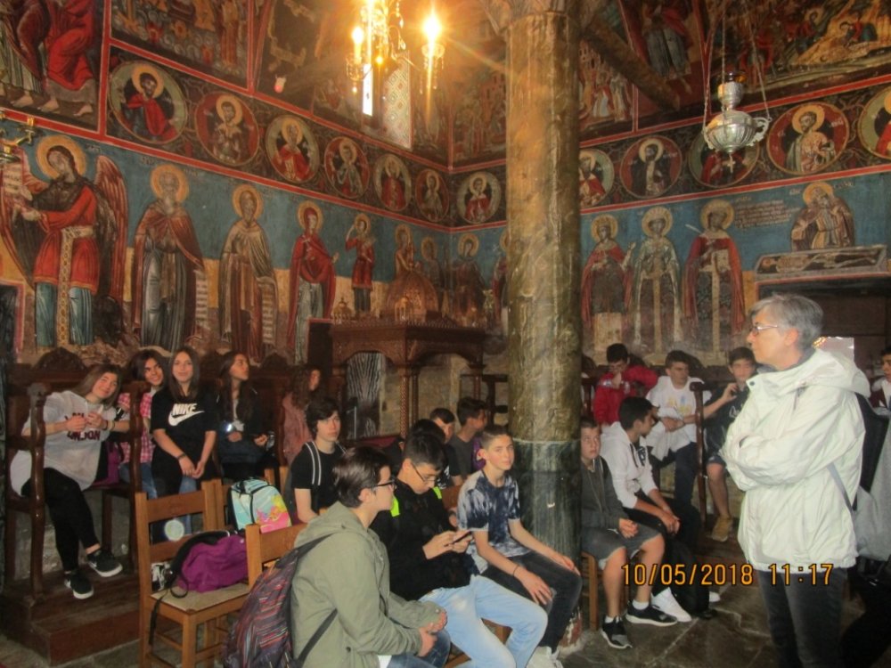 Στη συνέχεια, συγκεντρωθήκαμε ξανά όλοι μαζί, καθηγητές και μαθητές, στην εκκλησία των Παμμεγίστων Ταξιαρχών, όπου όπως πληροφορηθήκαμε από τον ιερέα η εκκλησία ανακαινίστηκε το 1741,ενώ είναι άγνωστο το πότε χτίστηκε πρώτη φορά και από ποιόν. Αποτελεί χαρακτηριστικό δείγμα της τοπικής παραδοσιακής αρχιτεκτονικής και διαθέτει αξιόλογες μεταβυζαντινές αγιογραφίες. Είναι χτισμένη έτσι ώστε ο κάθε ήχος μέσα σε αυτήν να μην ακούγεται έξω, γιατί απαγορευόταν ο Χριστιανισμός εκείνη την εποχή. Κατασκευάστηκε στα μέσα του 18ου αιώνα, κατά τη διάρκεια της Τουρκοκρατίας, κατά τέτοιον τρόπο, ώστε το εξωτερικό της, χωρίς καμπαναριό και άλλα θρησκευτικά σύμβολα ή δείγματα εκκλησιαστικής αρχιτεκτονικής, να μην προδίδει την αληθινή φύση του κτιρίου. Προσκυνήσαμε τις εικόνες, ανάψαμε από ένα κερί και με την σύντομη ενημέρωση από τον ιερέα πήραμε τις σημαντικότερες πληροφορίες για το ναό.