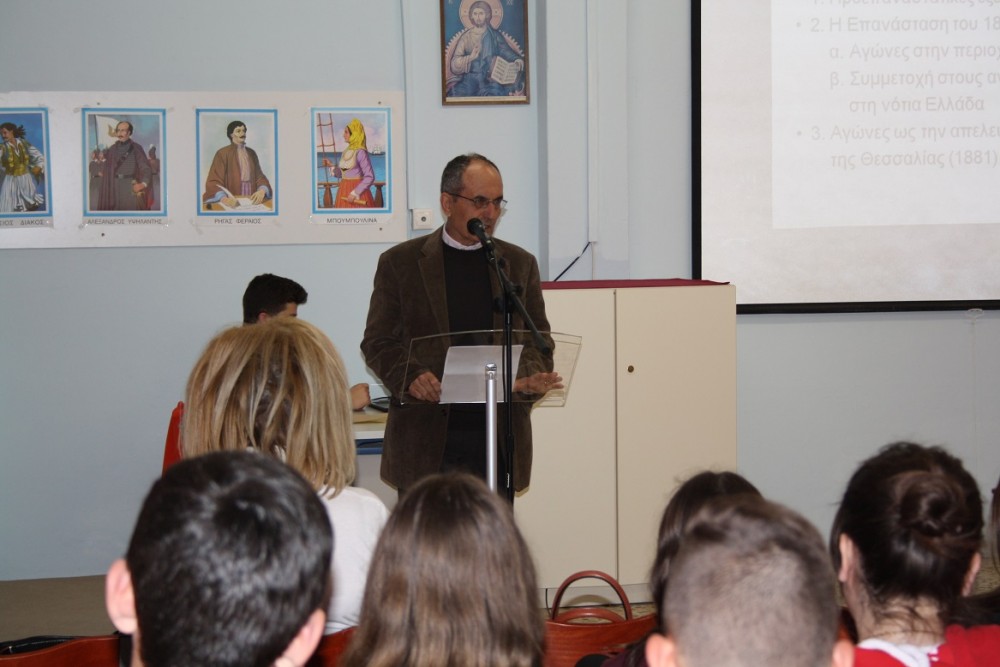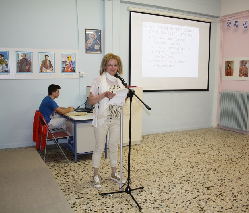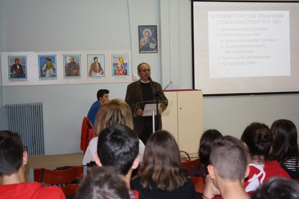 Με αφορμή την Εθνική Επέτειο της 25ης Μαρτίου 1821 και λαμβάνοντας υπόψη ότι αν και η συμβολή των Τρικαλινών αγωνιστών στον αγώνα για την απελευθέρωση της Ελλάδας από τον τούρκικο ζυγό ήταν σημαντικότατη, εντούτοις παραμένει σχεδόν άγνωστη (κυρίως στους μαθητές), οργανώσαμε στο 9ο Γυμνάσιο Τρικάλων σχετική εκδήλωση με ομιλητή τον φιλόλογο-ιστορικό, πρώην σχολικό σύμβουλο φιλολόγων δρα Θεόδωρο Νημά. Έναν άνθρωπο που έχει αφιερώσει τη ζωή του στη έρευνα και τη μελέτη θεμάτων ιστορίας, τοπικής ιστορίας και λαογραφίας και μέσω του Φ.Ι.ΛΟ.Σ (Φιλολογικού, Ιστορικού, Λογοτεχνικού Συνδέσμου) Τρικάλων, του οποίου διετέλεσε πρόεδρος πάνω από 30 χρόνια, έχει συμβάλει στην επιστημονική έρευνα και μελέτη της περιοχής των Τρικάλων.