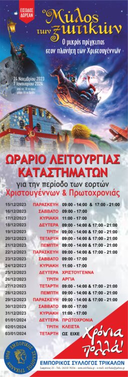 Ο Εμπορικός Σύλλογος Τρικάλων ενημερώνει τους συναδέλφους και το καταναλωτικό κοινό ότι το προτεινόμενο χριστουγεννιάτικο ωράριο για την αγορά των Τρικάλων ξεκινά από την Παρασκευή 15 Δεκεμβρίου 2023 και είναι το παρακάτω: